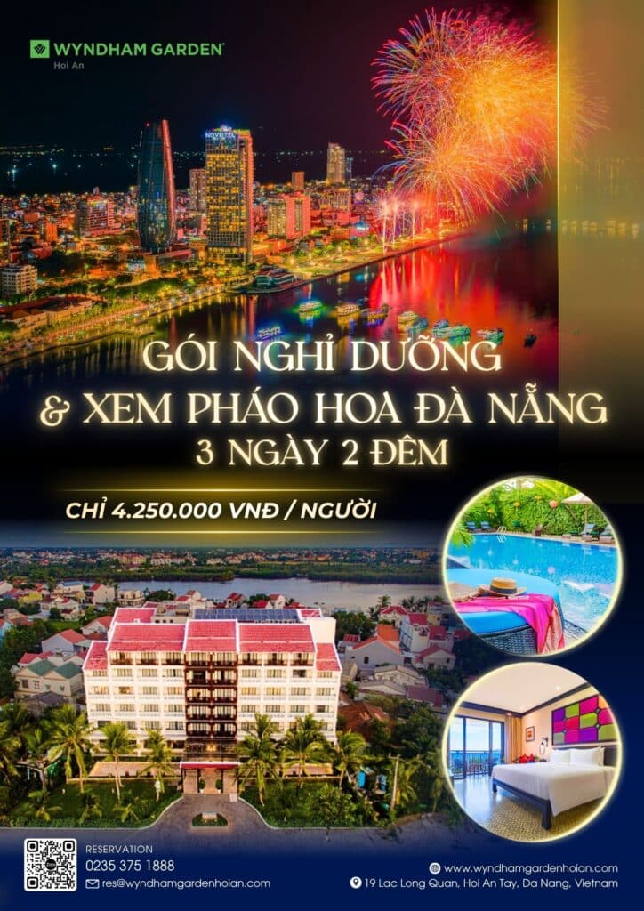 Đồng hành cùng mùa lễ hội rực rỡ ấy, Wyndham Garden Hoi An Cua Dai Beach giới thiệu gói nghỉ dưỡng cao cấp 3 ngày 2 đêm kết hợp xem pháo hoa – lựa chọn hoàn hảo cho những ai muốn tận hưởng kỳ nghỉ vừa thư giãn vừa đầy cảm hứng.